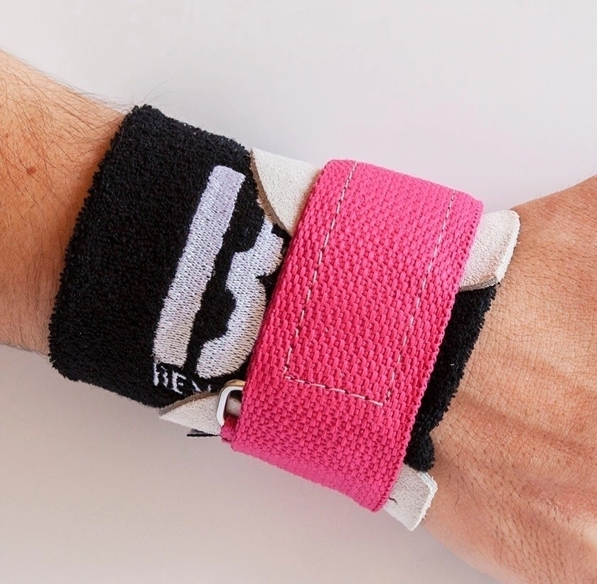 y lo podes combinar con muñequera violeta, negro o negro con rayas.